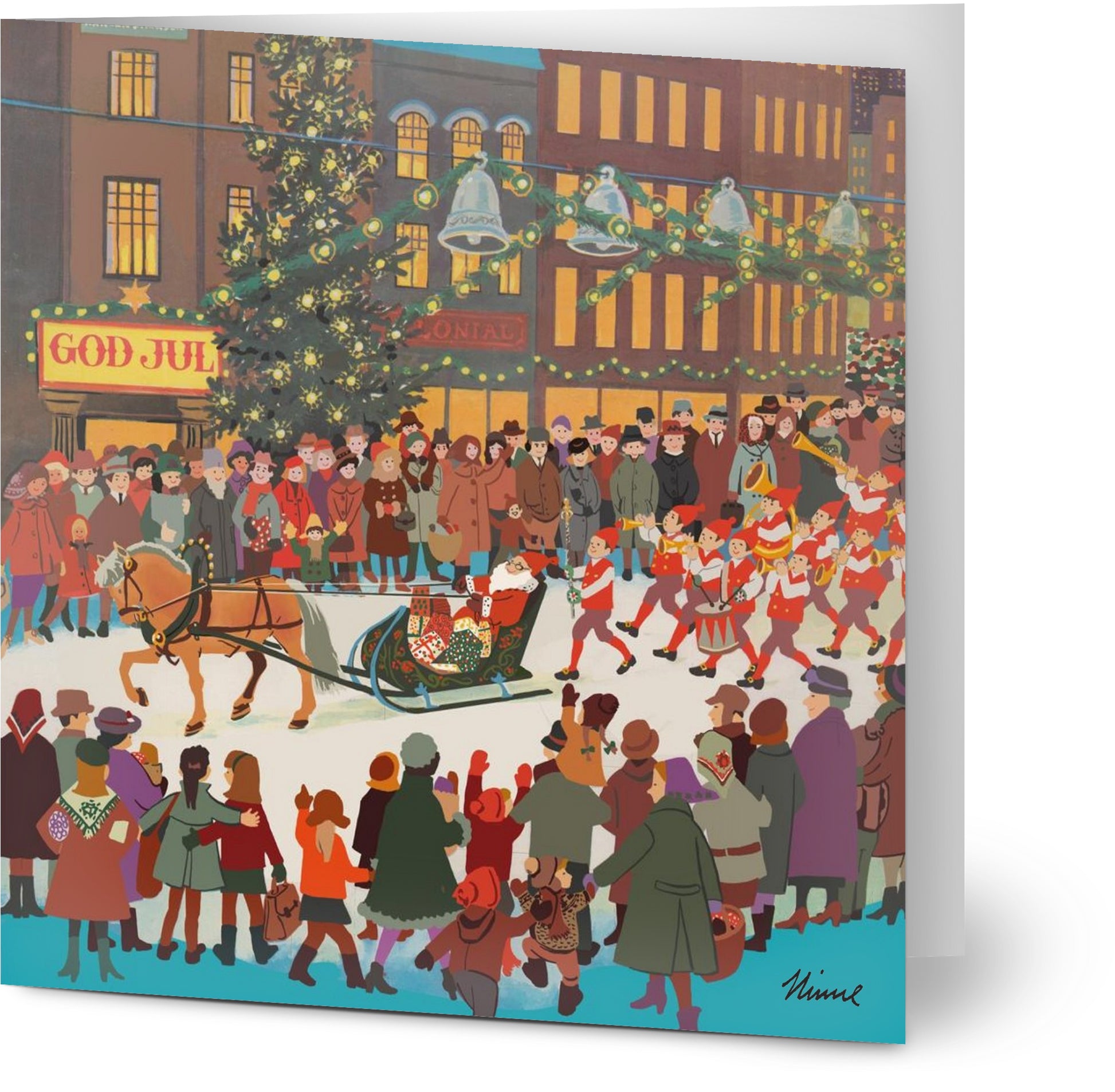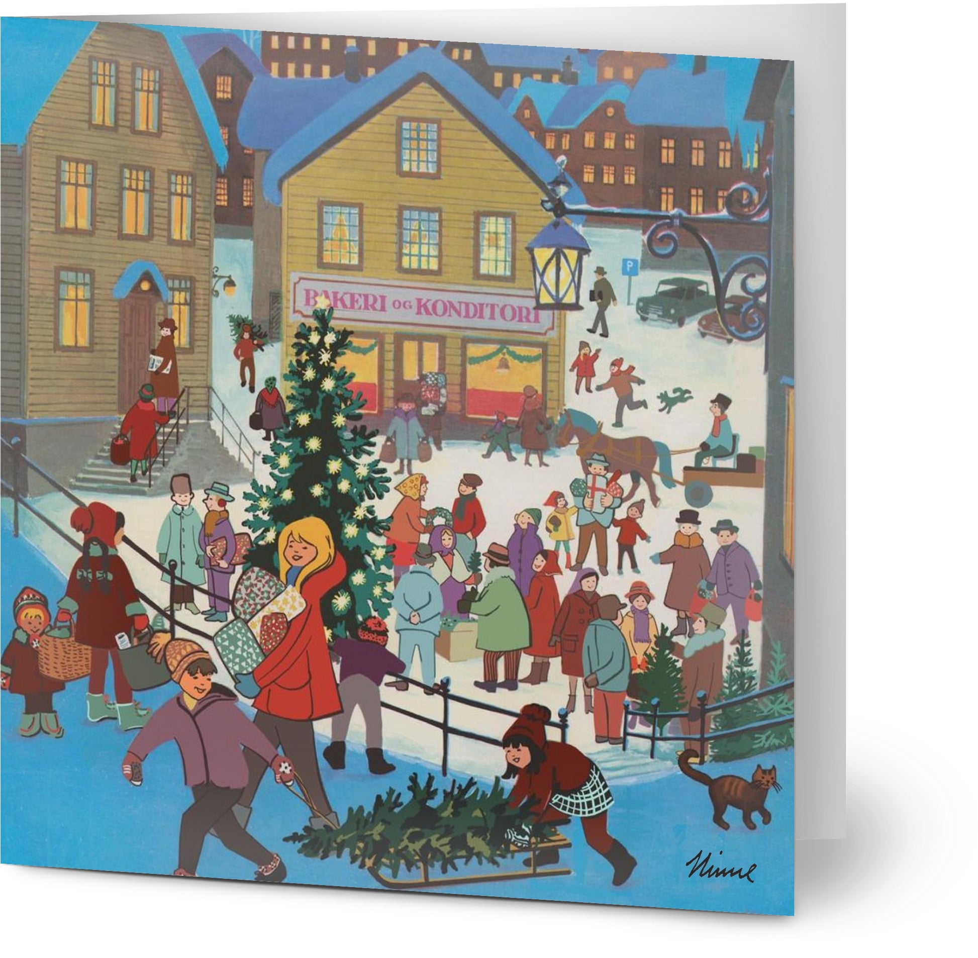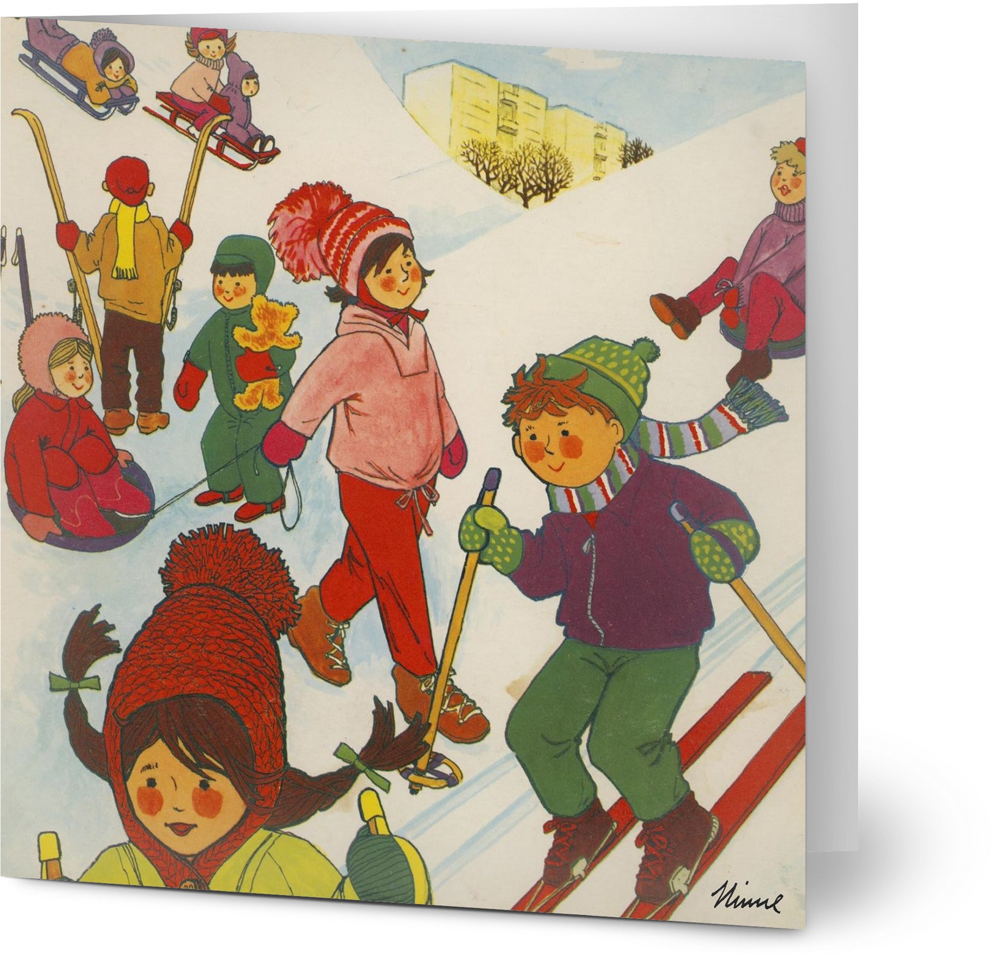 Juleillustrasjonene er hentet fra adventskalendere håndtegnet av Ninne på 70 tallet, og vintertegningen fra en billedbok. Inni kortet er det en "God Jul" tekst og en liten illustrasjon på venstre side og blankt på høyre side. Vinterkortet er blankt på begge sider inni.