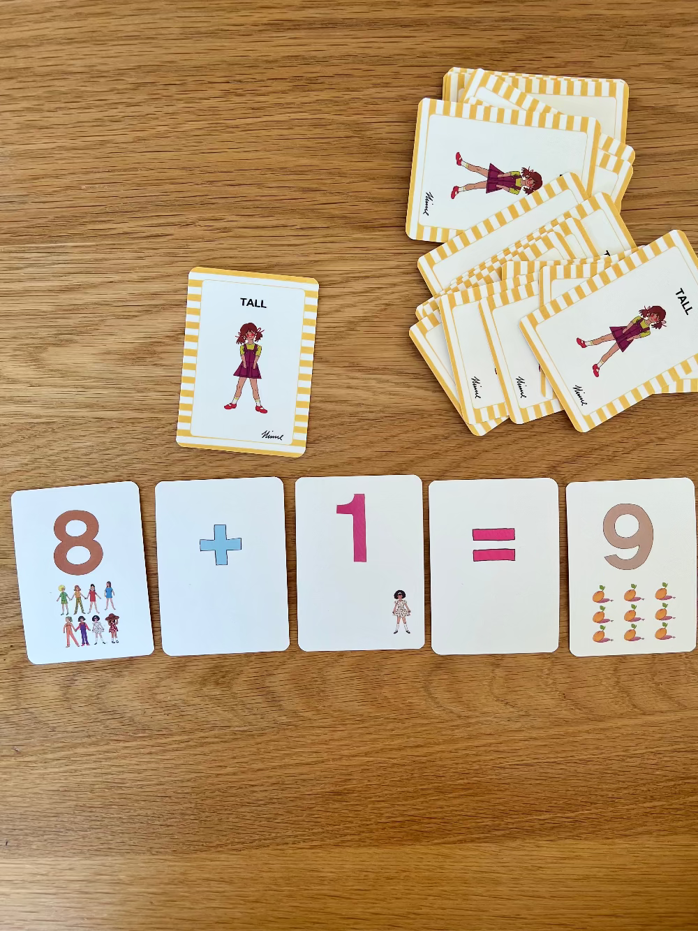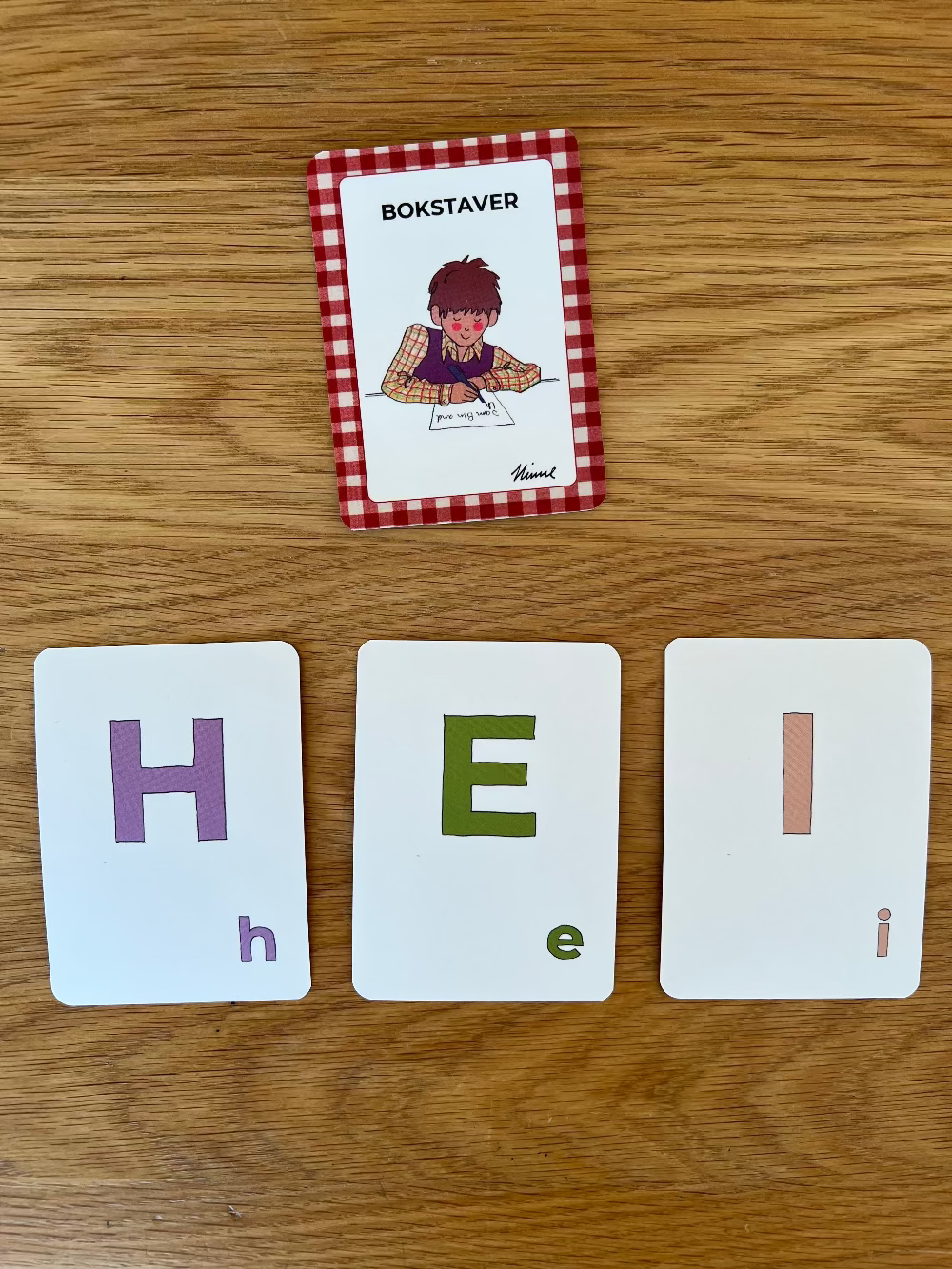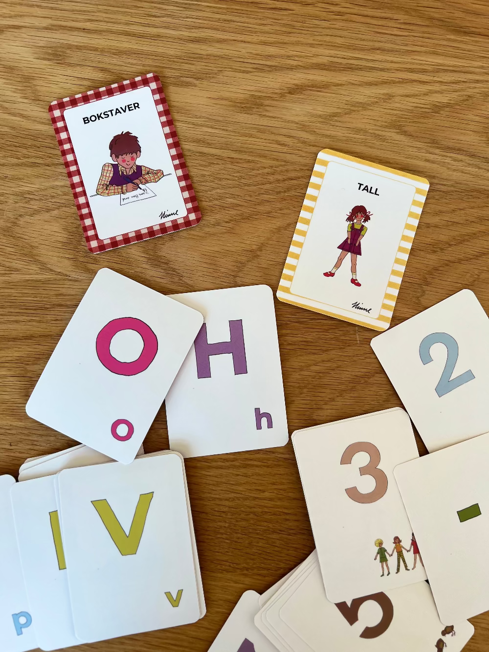 Bokstavkort (alle bokstaver i alfabetet) og tall fra 1-10 (dobbel sett), samt kort med +, - og =